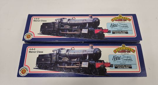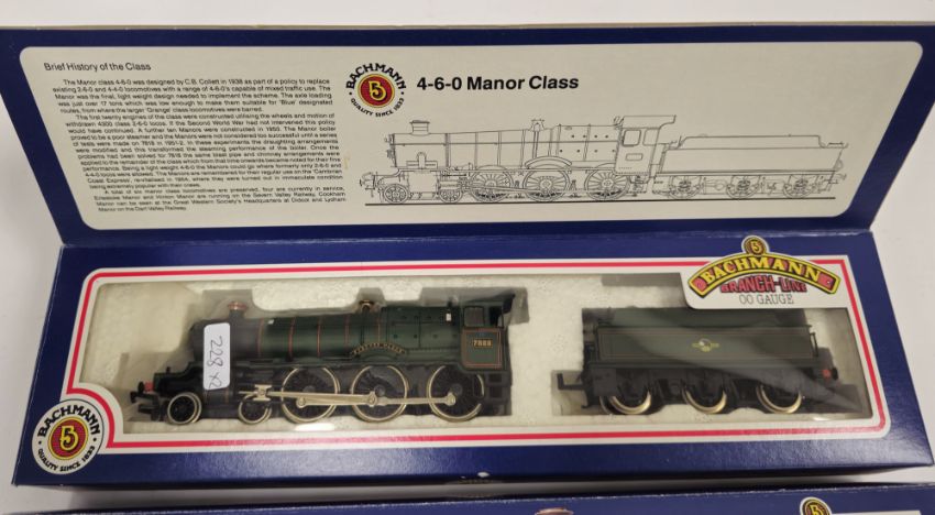 Two Bachmann Branch-line 00 gauge boxed locomotives and tenders to include 31.302 4-6-0 Manor class 'Bradley Manor' No.7802 locomotive and GWR tender in green livery and 31-306 Manor Class 'Foxcote Manor' No.7822 locomotive and BR tender in green livery (2)