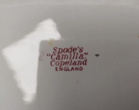 Royal Crown Derby bone china claret ground square section jar and cover, 20th century, printed green marks, printed and painted with bouquets of flowers within gilt shaped scroll cartouches, raised on gilt shell moulded feet, 17cm high and a collection of Staffordshire pottery transfer-printed dinnerwares, including a Spode Copeland Camilla pattern shaped rectangular serving dish, various Crown Ducal ironstone Bristol pattern side plates and dinner plates, a Johnsons Bros England historic America shaped square stand and other items, all printed in red