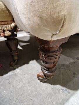 An antique upholstered armchair raised on turned legs, measuring approx 92 cm high Condition Report Seat depth is 62cm. Surface scratches, scuffs and knocks to the legs. Numerous stains to the upholstery. No holes or worm. Frame feels structurally solid. General wear and tear. We do not offer inhouse shipping, our other customers sometimes use shipply or cotswold transport for furniture and they can provide a quote