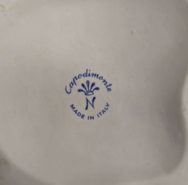 Three Royal Doulton figures comprising a figure titled 'A Gentleman from Williamsburg' HN2227, various printed and painted marks, 16cm high, 'Alexandra' HN2398, 'The Love Letter' HN2149, two Capodimonte figures of vintners, printed marks and two Crown Staffordshire bone china flower encrusted vases (7)