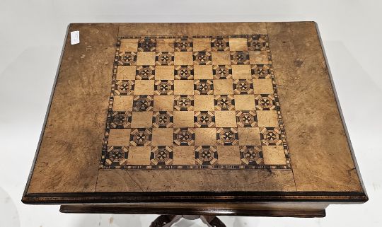 Victorian walnut parquetry inlaid games and work table, the hinged top revealing baize gaming board and a compartmentalised work table, work interior with covers in green silk and flowered, on a flared square-section base and four foliate carved scroll legs, 74cm high x 54cm wide x 40cm deep