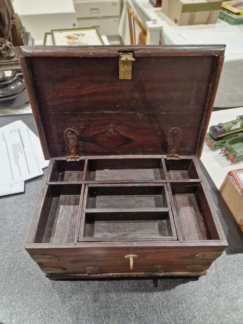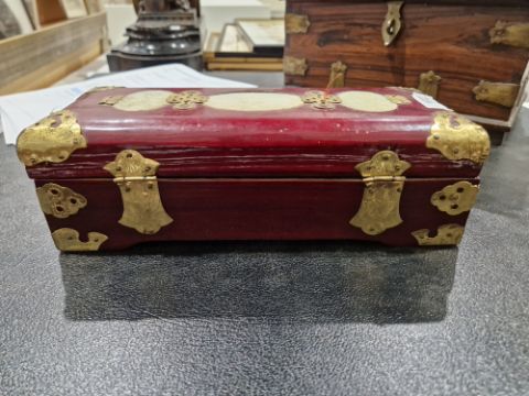 Victorian rosewood and brass-mounted toilet box, the interior fitted with compartmentalised trays bound with brass rivets, 30.5cm (damages) and a 20th century Chinese red lacquer jewellery box, brass bound and mounted with carved jade-style oval medallions (2)