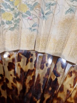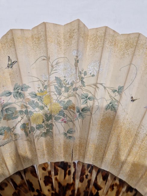 Japanese tortoiseshell painted paper fan, the guards inlaid with gilt metal and mother-of-pearl, coral, gilt metal, bamboo and trailing leafy tendrils, Meiji period (1868-1912), painted with figures on sampans before pavilions in a lakeside landscape and butterflies, insects and loose garden flowers, on tortoiseshell staves, bearing printed calligraphic signature and red seal mark