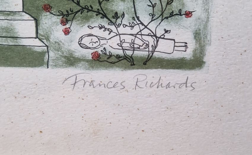 After Frances Richards (1903-1985) Three framed panels, lithographs on paper, circa 1975 'Prose, Poems From Les Illuminations of Arthur Rimbaud', each scene signed in pencil and numbered 2/20, with Dawn, Bottom, Mystic, Childhood II, Being Beauteous and Devotion text, all framed and glazed, 108cm x 82cm