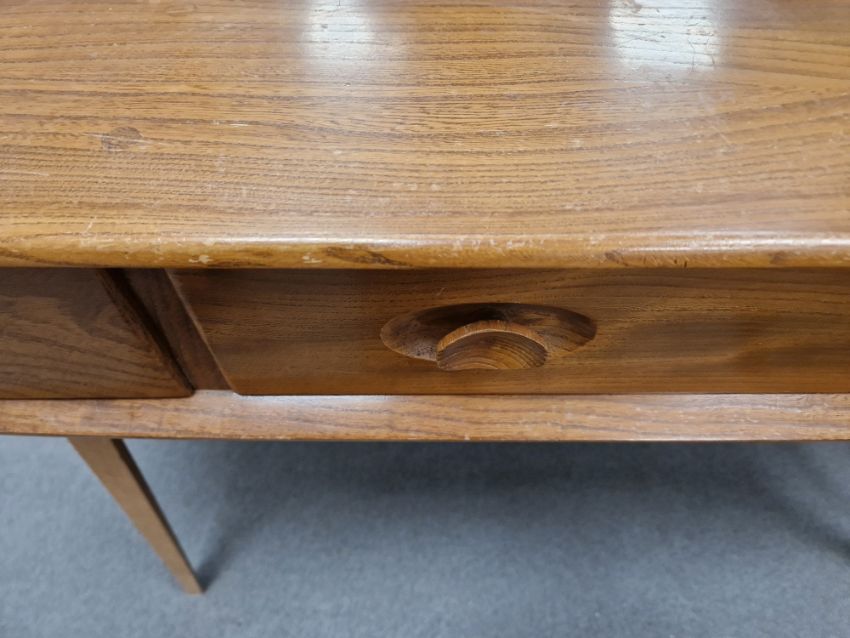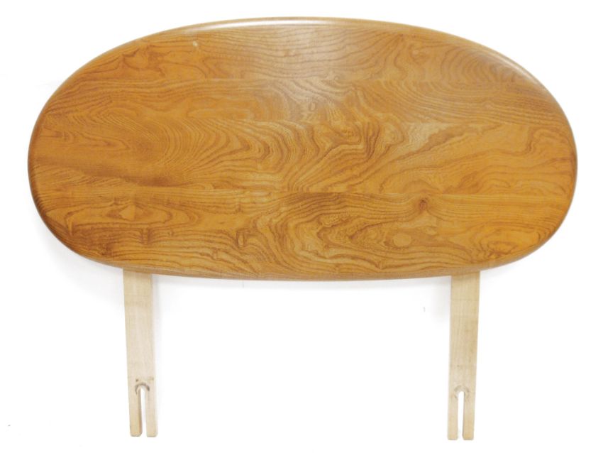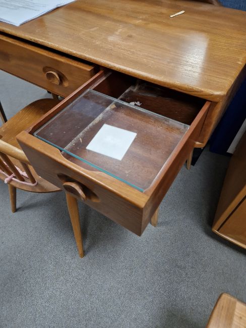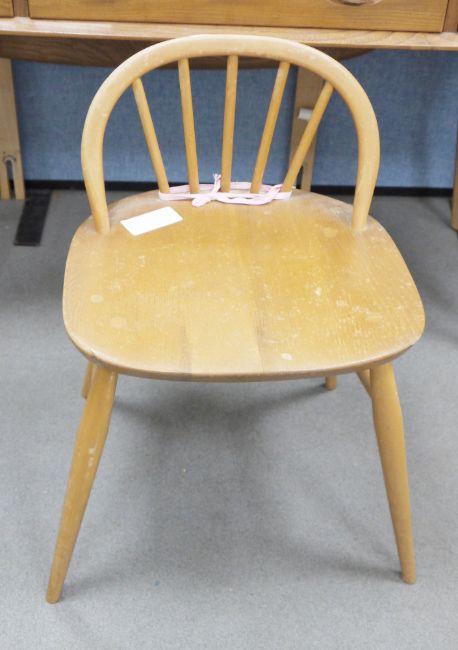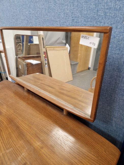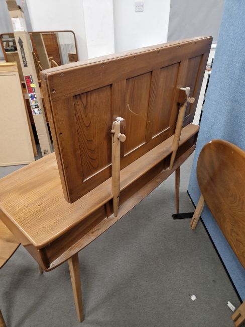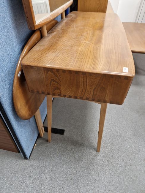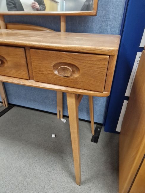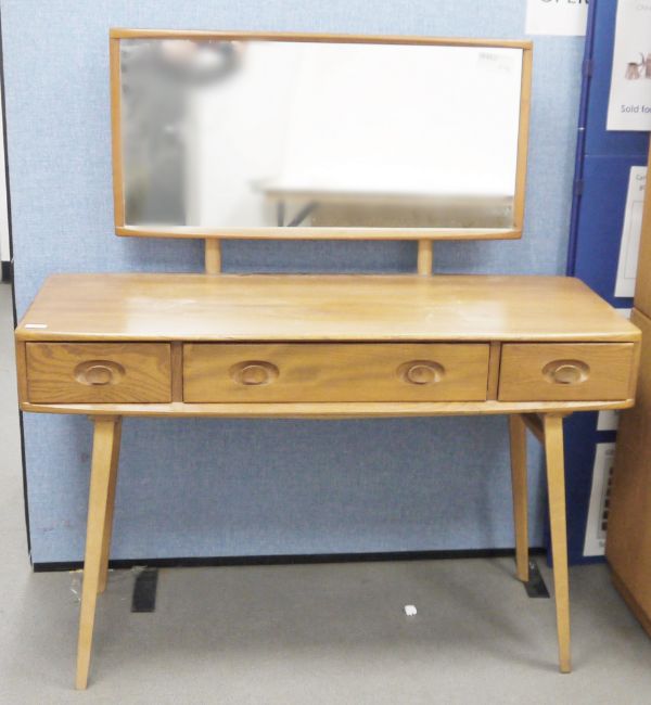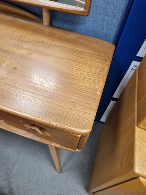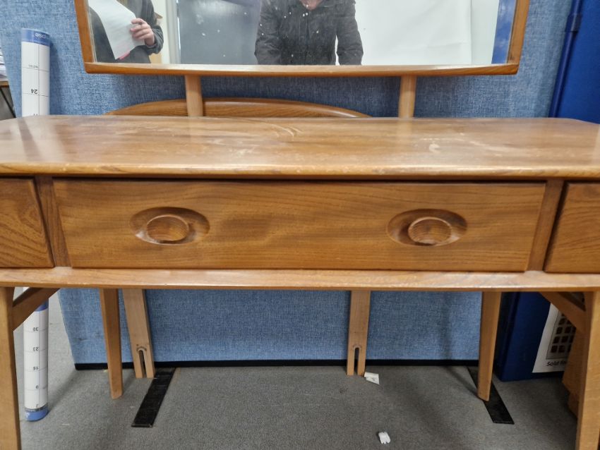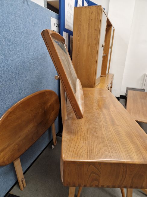 Ercol 'Windsor' range elm dressing table and chair, the rounded rectangular top mounted by rectangular mirror, over three frieze drawers with stylized handles raised on splayed legs including a low back Windsor chair and an Ercol oval single head board (3)  Condition Report Light surface scratches, scuffs and knocks, areas of fading/discolouration. Some watermarks to top. Drawers open and close smoothly, there is one glass shelf in both of the small drawers. Mirror holds when tilted. Structurally solid. General wear and tear.Height incl. mirror 124cmWidth 114cmDepth 48cm