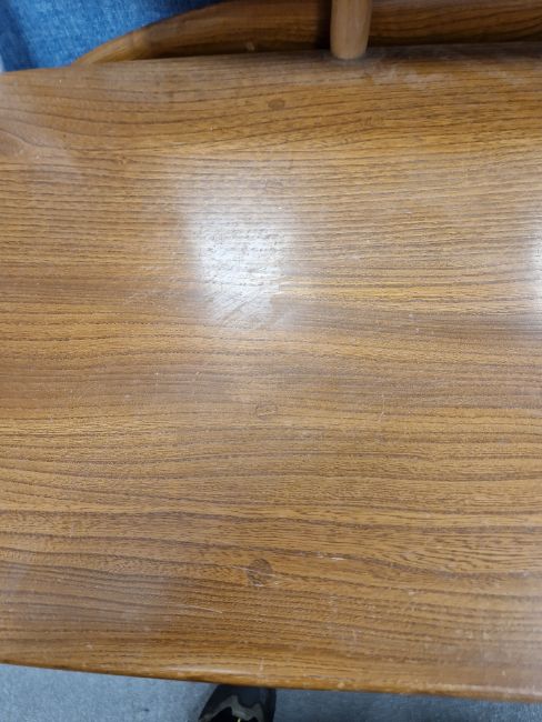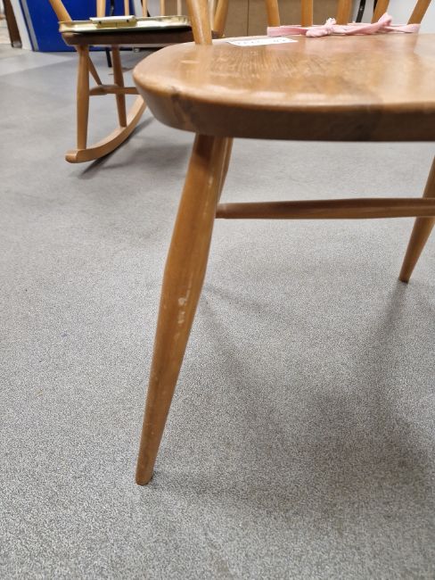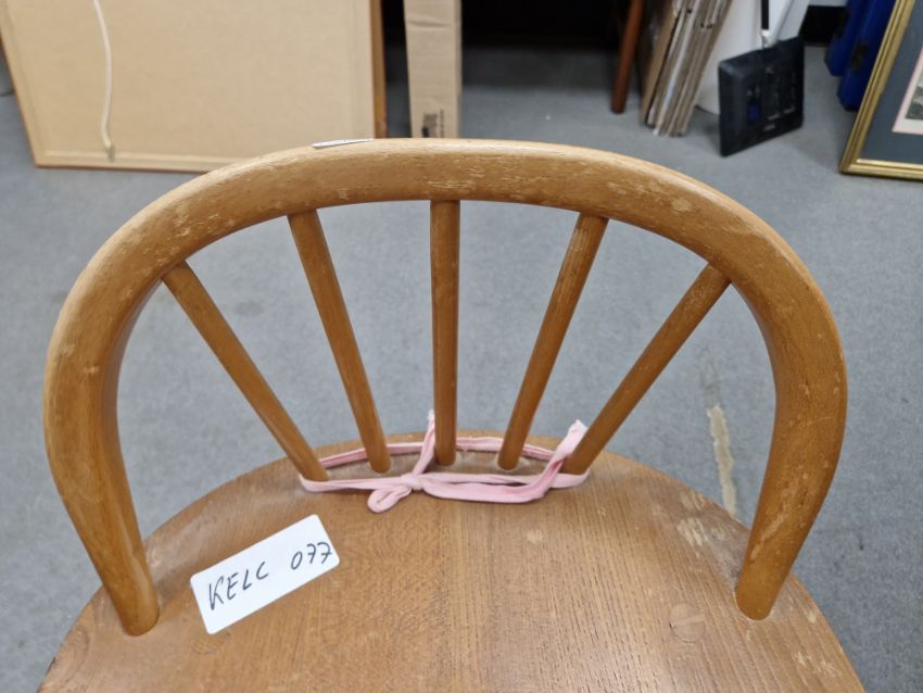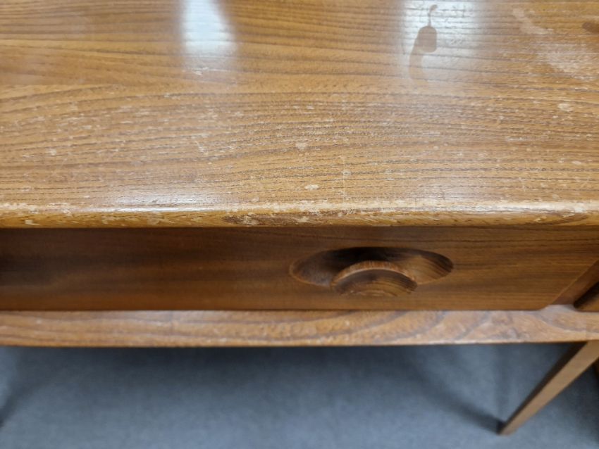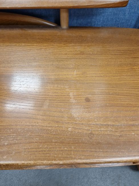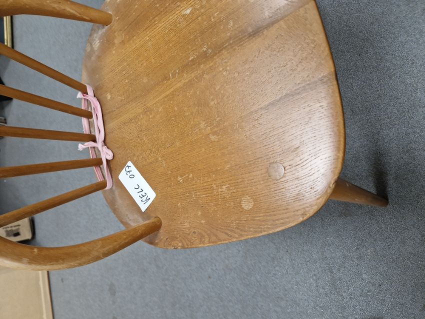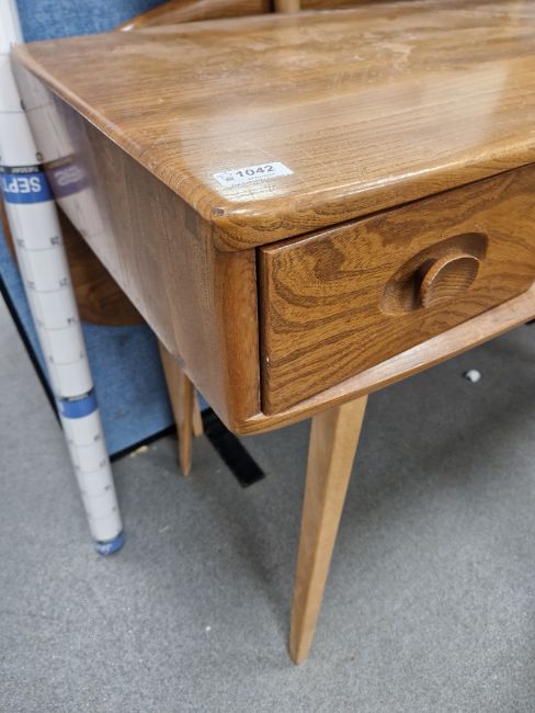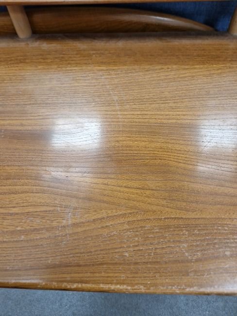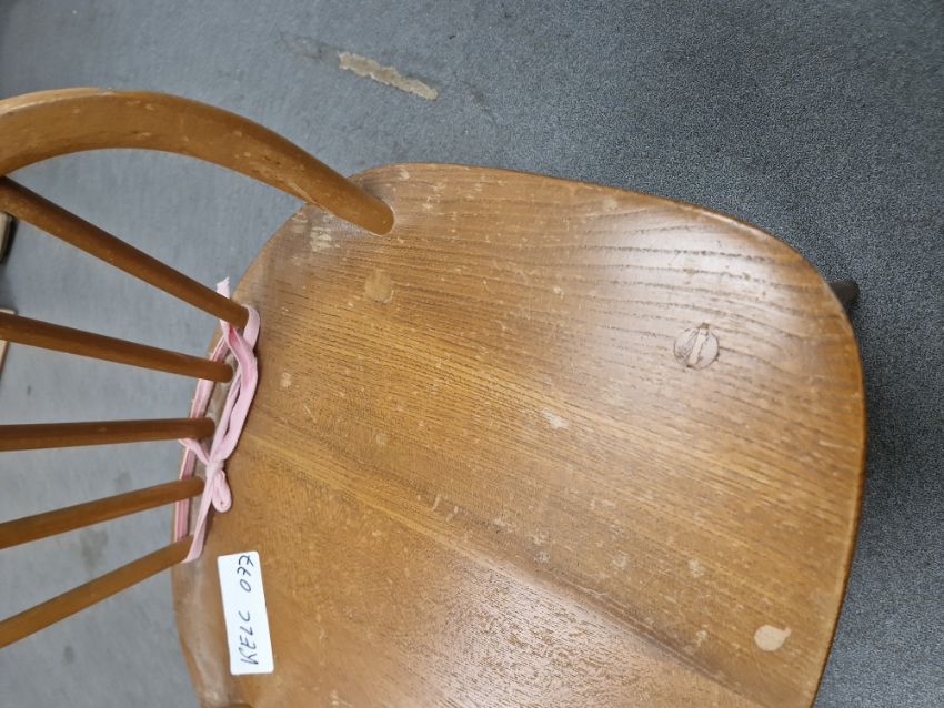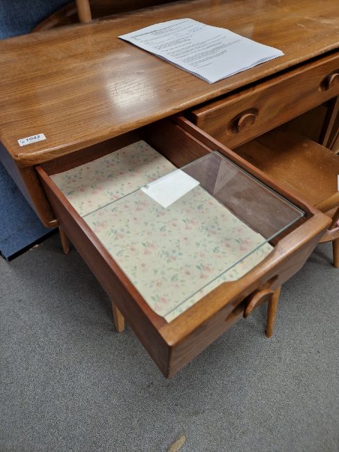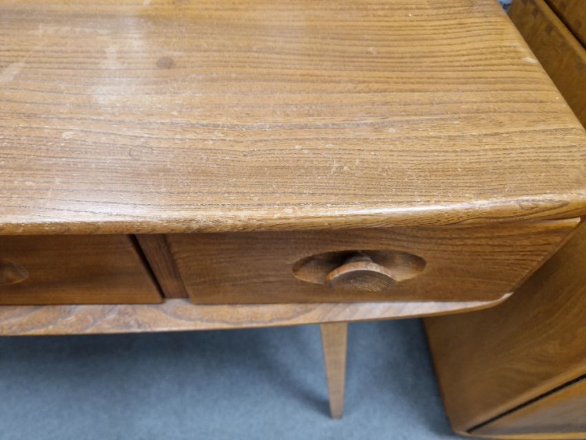 Ercol 'Windsor' range elm dressing table and chair, the rounded rectangular top mounted by rectangular mirror, over three frieze drawers with stylized handles raised on splayed legs including a low back Windsor chair and an Ercol oval single head board (3)  Condition Report Light surface scratches, scuffs and knocks, areas of fading/discolouration. Some watermarks to top. Drawers open and close smoothly, there is one glass shelf in both of the small drawers. Mirror holds when tilted. Structurally solid. General wear and tear.Height incl. mirror 124cmWidth 114cmDepth 48cm