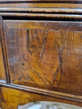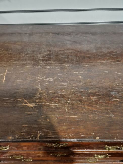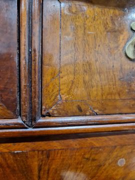 George II walnut chest on stand, circa 1730, the moulded top above one long and two short drawers above three long graduating drawers, the stand with a central frieze drawer flanked by two short drawers, all cross banded with brass swing handles, on cabriole legs and pad feet, 162cm high x 107cm wide x 54.cm deep    Condition Report Surface scratches, scuffs and knocks. Splits to both sides of top and bottom sections. Areas of loss and repaires to the veneer. Handles appear to have been replaced. Some fading, discolouration and stains. General wear and tear.We do not provide postage/shipping for items. Would advise arranging own courier.