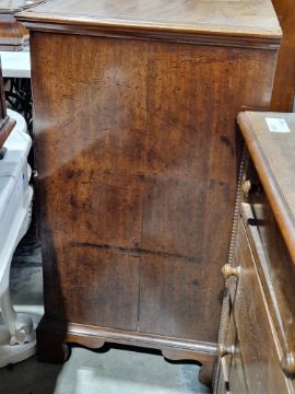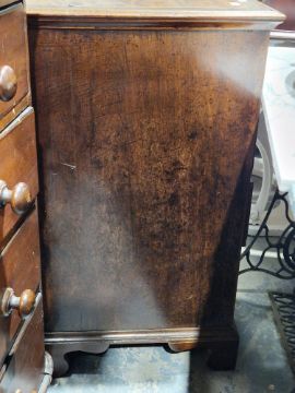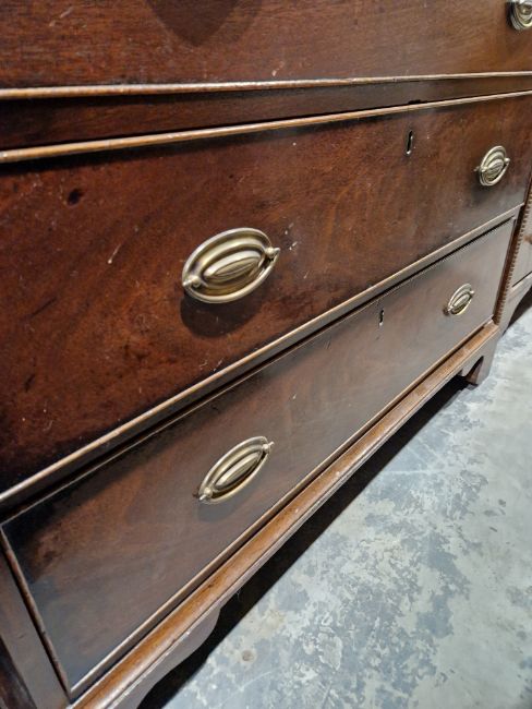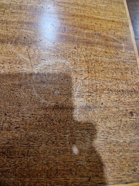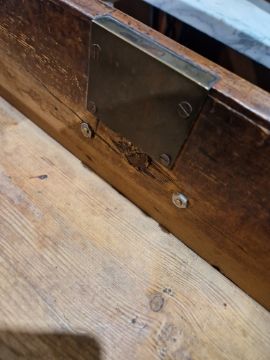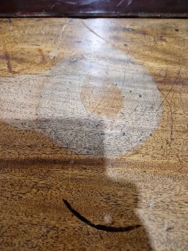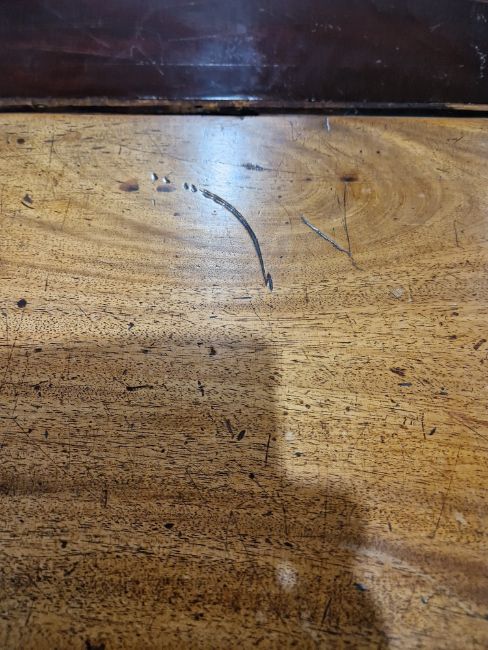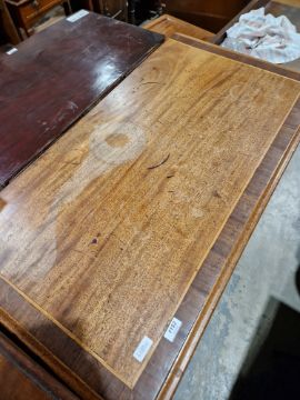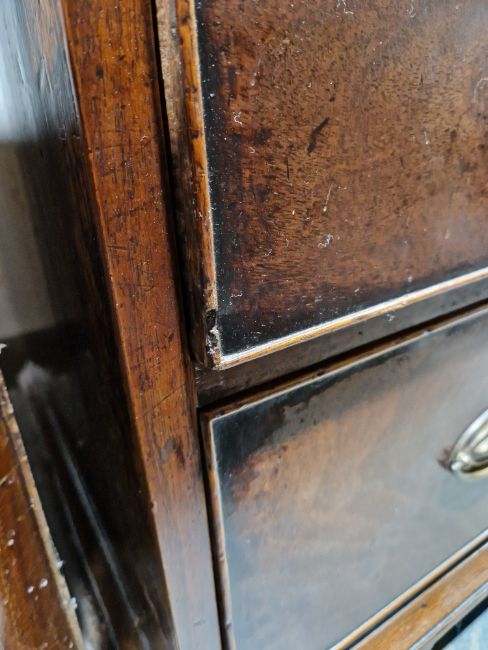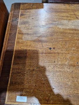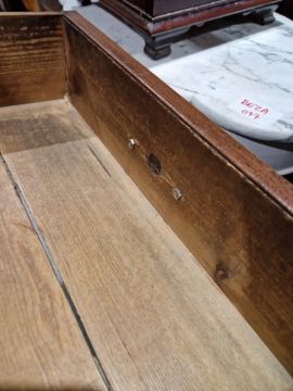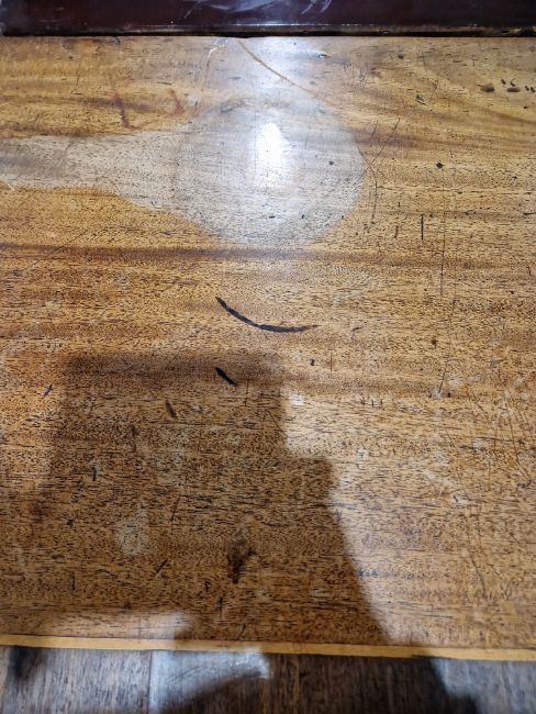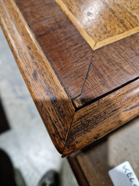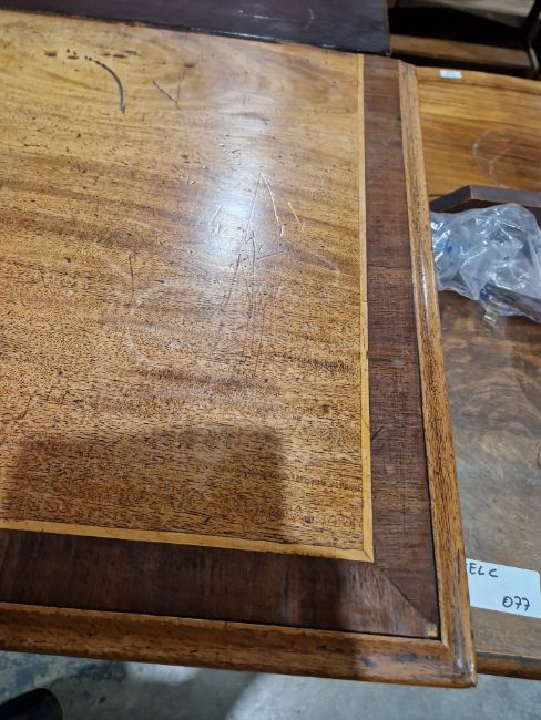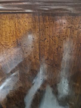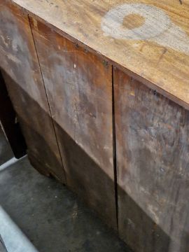 Surface scratches, scuffs and knocks. Fading/discolouration in places, stains and water marks. Losses to the beading. Handles are replaced. Split to right side. General wear and tear.