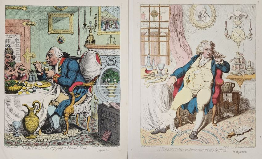 A folio of 20th century limited edition coloured prints after James Gilray (1756-1815), comprising: A Voluptuary under the Horrors of Digestion, Temperance, The Morning After Marriage, Bandelures and A Wife and No Wife, all limited edition no. 1650/2500, bearing United Edition ST blindstamps