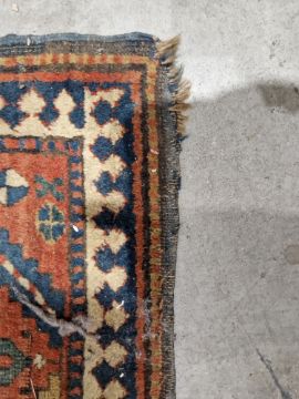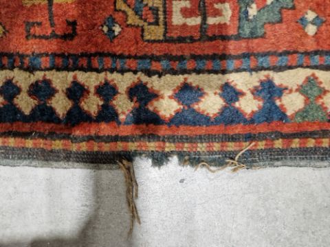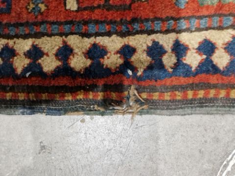 Wear and uneven wear. Areas of dading/discolouration. Loose threads, losses and tears to the edges. Appears to be some repairs / restiching to areas. General wear and tear.