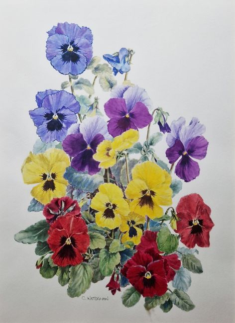 Moira Venn (20th century) Watercolour "Turbo Blue/White" study of pansies, signed lower right, framed and glazed, image size 20cm x 32.5cm Catherine Waterman Watercolour "Winter Pansies", signed lower left, framed and glazed, image size 35cm x 25cm, together with two further floral studies signed Dinorah (4)