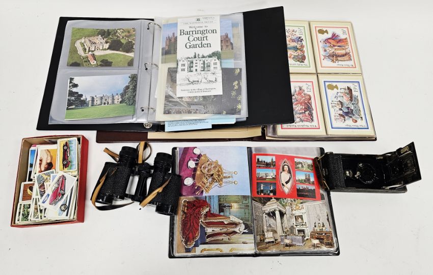 Assorted postcard albums including Stanley Gibbons and others, partly filled with UK architectural and landscape photographica, two vintage photograph albums, assorted loose postcards, mid to late 20th century, The History of the Motor Car Brooke Bond tea cards, an early 20th century Tengor Goertz folding cameraa pair of Carl Zeiss Jena binoculars, cased and other items