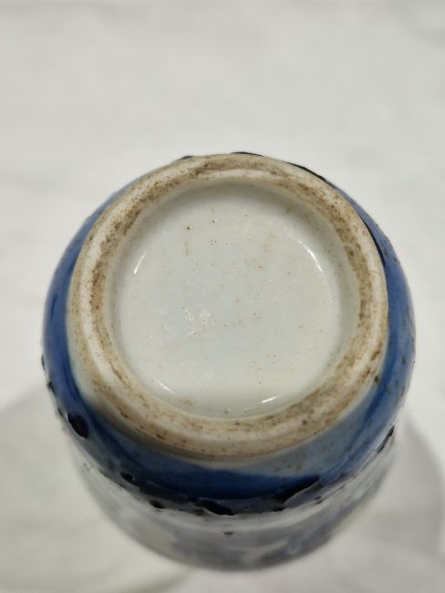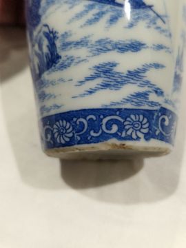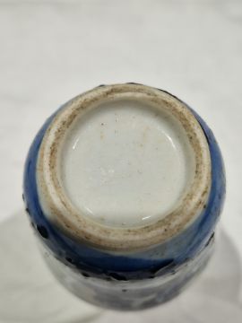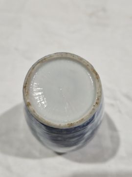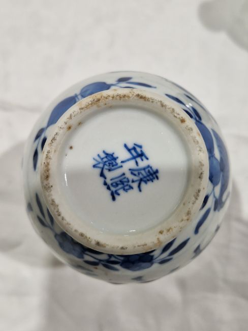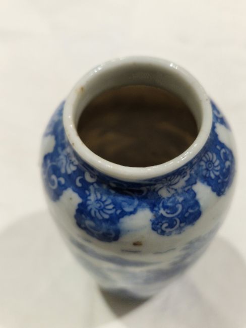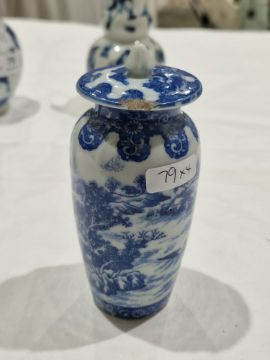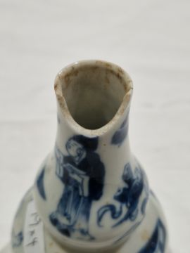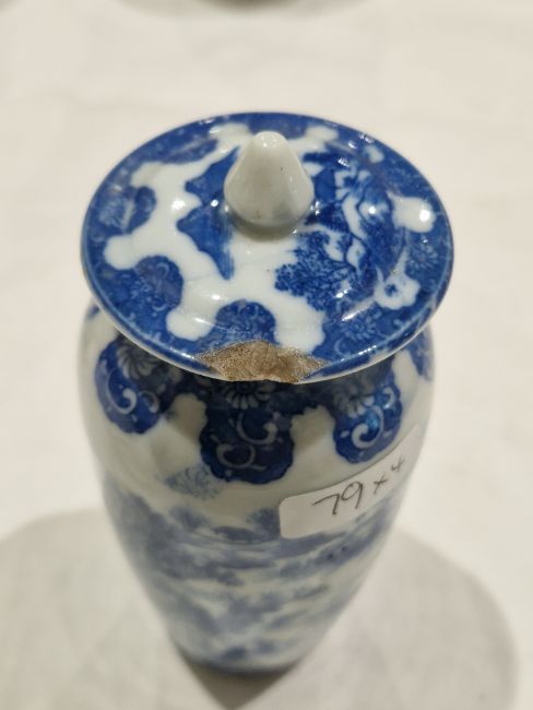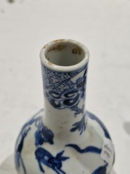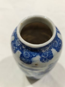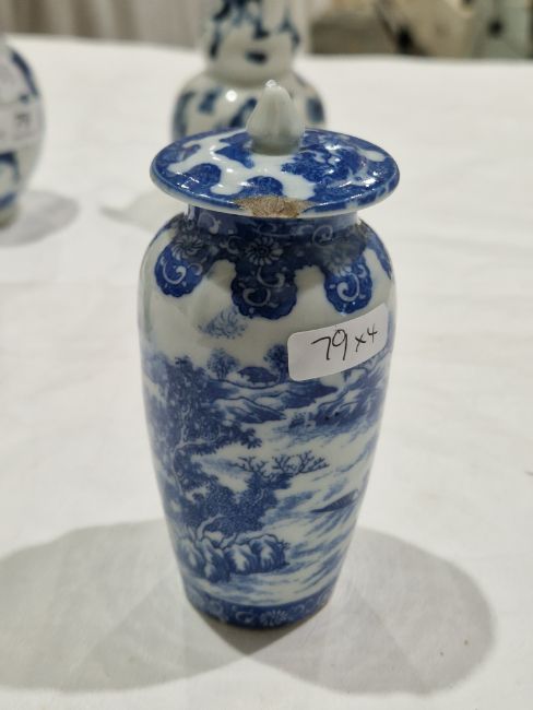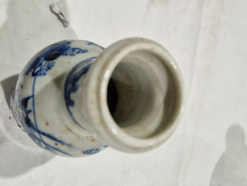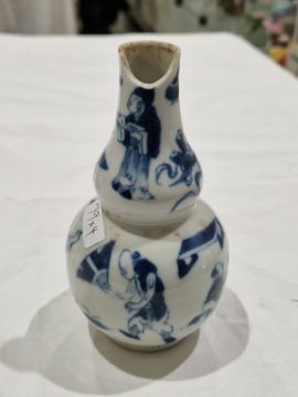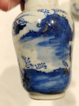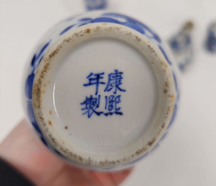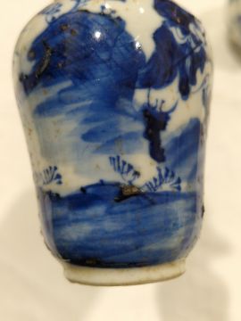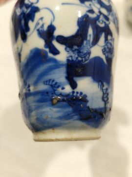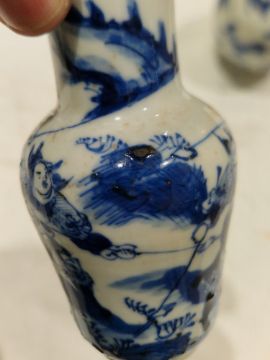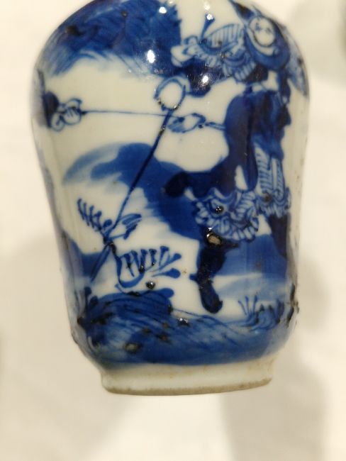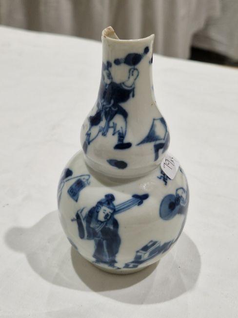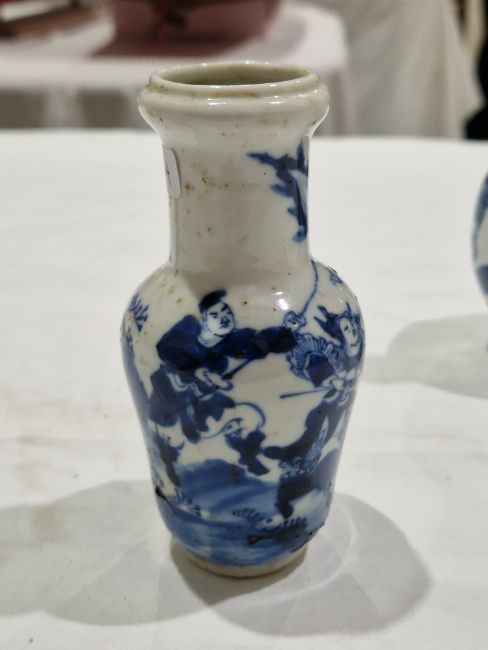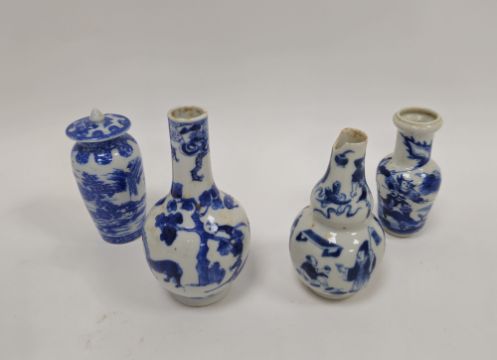 Collection of Chinese porcelain blue and white small vases, variously painted in the Kangxi-style, probably 18th century and later, the first decorated with warriors in landscape, a double-gourd shaped vase decorated with figures and utensils, a small bottle-shaped vase painted with animals in landscape, four-character reign mark in blue to base and a Chinese-style miniature oviform vase and cover, transfer-printed with huts on islands (losses to the double-gourd shaped vase and rim chipping), largest 15.5cm high (4)  Condition Report Double gourd vase -  loss to rim, light surface marks, accretions.Warrior vase - imperfections in glaze and losses, small chip to foot.Vase & cover - Chip to cover, accretions and surface marks.All with general wear and tear.