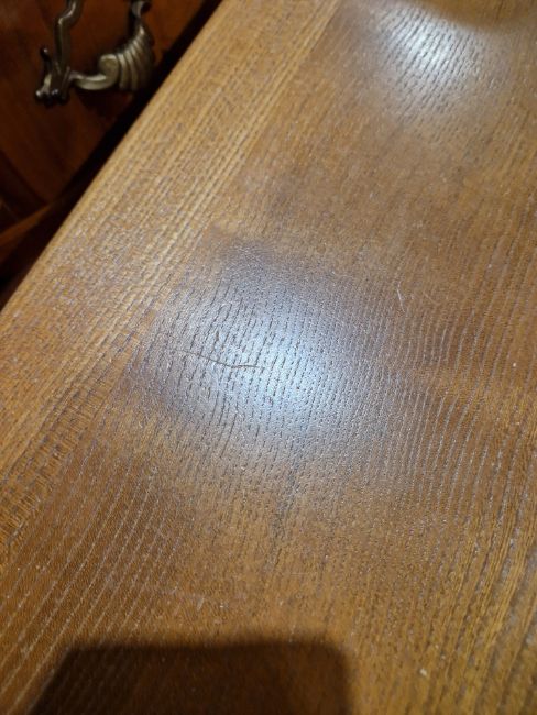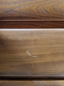 Light surface scratches, scuffs and knocks. Drawers open and close smoothly. Small split to bottom of left side. General wear and tear.
