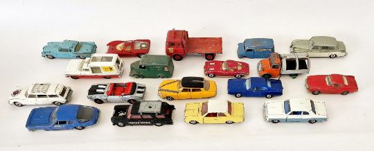 Quantity of playworn diecast model cars to include Dinky Toys Bedford refuse wagon, Corgi Toys Studebaker Golden Hawk, Corgi Toys Citroen Safari, Corgi Toys Whizzwheels Pininfarina Alfa Romeo P33, Dinky Toys  Trojan 15 CWT van 'Chivers Jellies', Dinky Toys Bedford 'Ovaltine' van, Corgi Toys Chevrolet Impala kennel service wagon etc (one box)