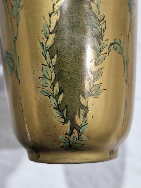 Limoges porcelain oviform vase, circa 1900, printed puce marks, inscribed Emaux d'Art in gilding, hand painted decoration with poppies and a butterfly on gilt ground, indistinctly signed Boisson or Bolsson?? 18cm high