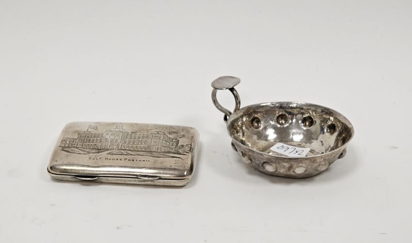 Late Victorian silver cigarette case with engraved decoration to the front depicting Government House, Pretoria, hallmarked Chester 1899 by Paton Pepper & Sons Ltd and a hallmarked silver porringer, gross weight 118g approx./3.8ozt (2)