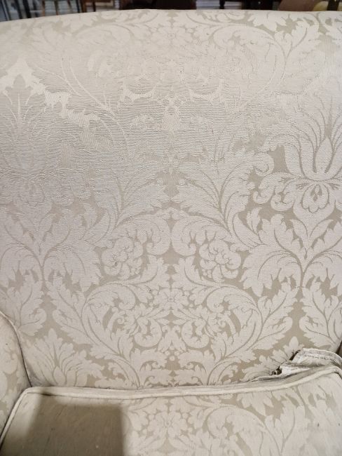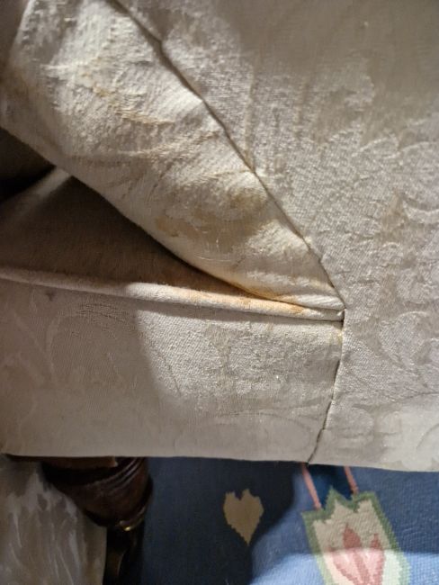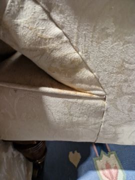 No makers mark on legs. The upholstery has stains and the legs have scratches and scuffs. Cushion is filled with feathers. General wear and tear