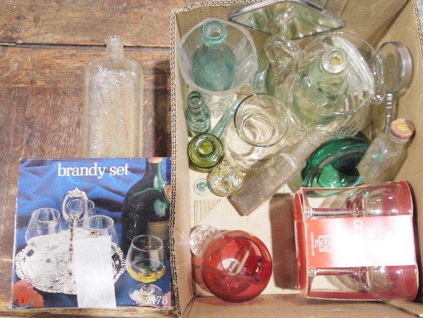 Boots the Chemist vintage glass bottle, the peddler and his dog by Mary C Rosewell, a naturelle lavender fine earthenware part dinner servicean art glass candle holder and various other items (3 boxes)