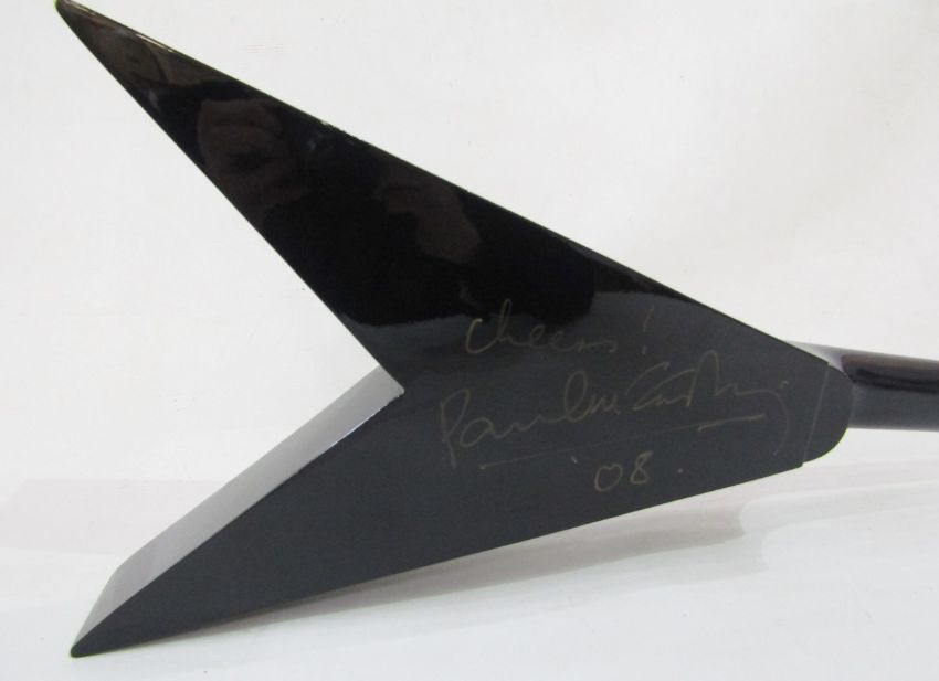Mahalo Ukulele owned by Shaun Keaveny and signed by Paul McCartney, sold in charity auction 2008, inscribed in gold ink  'Cheers! Paul McCartney' and dated '08', labelled and No. UFV1/BK, in a signed case, together with a BBC Children in Need certificate of authenticity (11 November 2008), a certificate signed by Sir Terry Wogan, a signed photograph of Wogan and various corresponding prints of images of the signing of the instrument Provenance: from the collection of Mr George Ridgeon, Gloucestershire  Condition Report The ukulele presents as being in very good condition, possibly never used. There are a couple of very small scratches, but these are only visible on close inspection. There is a very small chip to the paintwork at the corner of the 'V' shaped body of the ukulele.