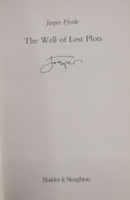 Fforde, Jasper. " Something Rotten" Hodder and Stoughton 2004, signed 'Jasper' on the title page,  " The Well of Lost Plots" Hodder and Stoughton 2003, signed 'Jasper' on the title page, " First Among Sequels" Hodder and Stoughton 2007, " One of Our Thursdays is MIssing" Hodder and Stoughton 2011, signed 'Jasper' on the title page, " Lost in a Good Book" Hodder and Stoughton 2002, signed 'Jasper' on the title page, " The Eyre Affair" Hodder and Stoughton 2001, signed in capitals on the title page, all with fine dustwrappers, not price clipped. ( 6)