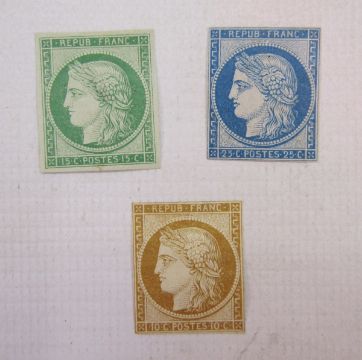 Stamps of France: Three mint 1862 Ceres head reprints - 10c bistre (SG29), 15c green (SG30) and 25c blue (SG32), cat total £2450.