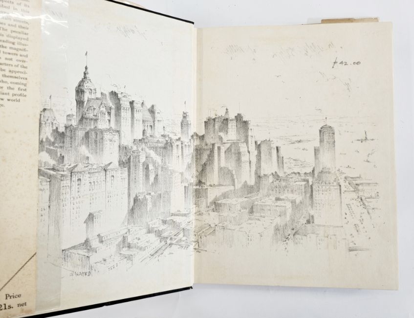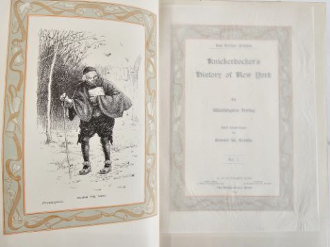 "Knickerbocker's History of New York by Washington Irving", illustrations by Edward W Kemble, GP Putnam's, the Knickerbocker Press 1894, The Van Twiller edition, bevelled boards with white cloth, gilt decorations with blue stamped borders, gilt titles and decorations to backstrip, decorated ep, all pages with decorations, t.e.g., very top of boards slight soiling, vols 1 and 2 complete  Fleming, Ethel  "New York", illustrations by Herbert S Cates, A & C Black Ltd 1929, sepia plates with lettered paper guards, some slight foxing, none of the plates are affected, skyline of New York ep, black cloth with skyline of New York to front board and gilt titles, dust wrapper not price clipped, slight chips and tears to backstrip, slightly cocked (3)