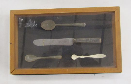 Two cased displays of horn antler and bone cutlery, late 19th/early 20th century, including two white metal mounted horn spoons, an antler handled carving knife, a bone marrow scoop and other items, and a Cardinal Ruby Lane early electric dark room lamp (3)