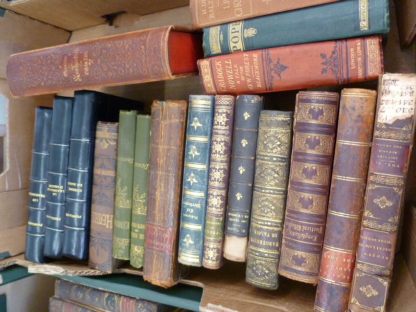 Quantity of antiquarian bindings to include Scott's Prose Works,  Robert Cadell, engraved frontis and vignette on title page to each vols, 24 vols, quarter leather sm 8vo., Proude's History of England', Walter Scott etc  (3 boxes)
