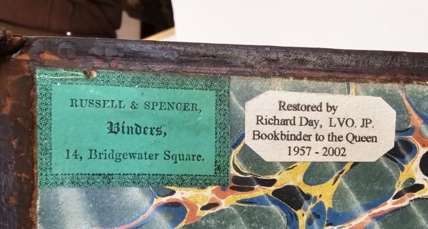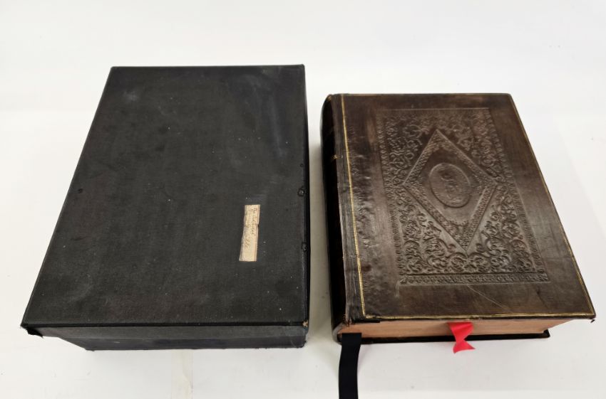 Fine Binding - Holy Bible printed at the Pitt Press by John William Parker, Cambridge, 1837 - restored and bound by Richard Day - bookbinder to her Late Majesty The Queen. Full leather, tooled panels with central lozenge design on both boards, gilt rules, marbled end papers and black and red silk ribbon markers, family history on ffep, John Hill, The Citadel, Hawkestone April 1845, with a black cardboard box