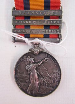 Boer War Queen's South Africa medal awarded to '3334.Pte.J.Ward.North Staff.Regt', relief of Kimberley, Orange Free State and Transvaal clasps