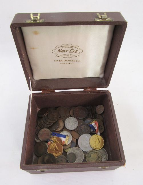 Box containing various coins and medals, of note 1876 silver Chilean Un Peso, 1791 Louis XVI, 1791 2 Sols