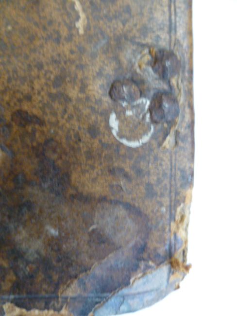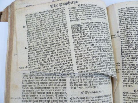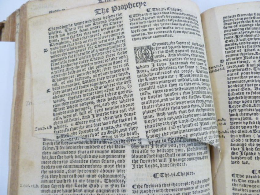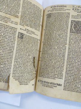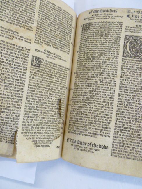 Holy Bible - Note -  we believe the bible is a 1550 version of The Great Bible , printed for circulation in Ireland , incomplete, initial pages missing including title pages, begins with Chapter 27 Genesis, woodcut letters, some pages cut and damaged, there is staining and ink marks , foxing, final page is the end of St. John, burn holes to the end paper and final pages of text , contemporary full leather, panelled and tooled boards, remains of clasps, trimmed as can be seen from some images. 23cm x 17cm PLEASE SEE COPIOUS IMAGES OF THE VARIOUS DAMAGED PAGES , AND MORE DETAIL OF OTHERS
