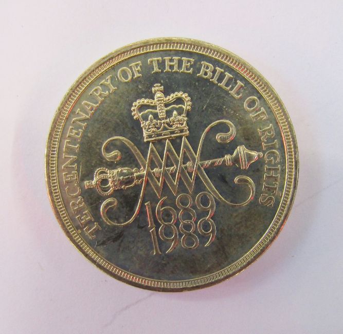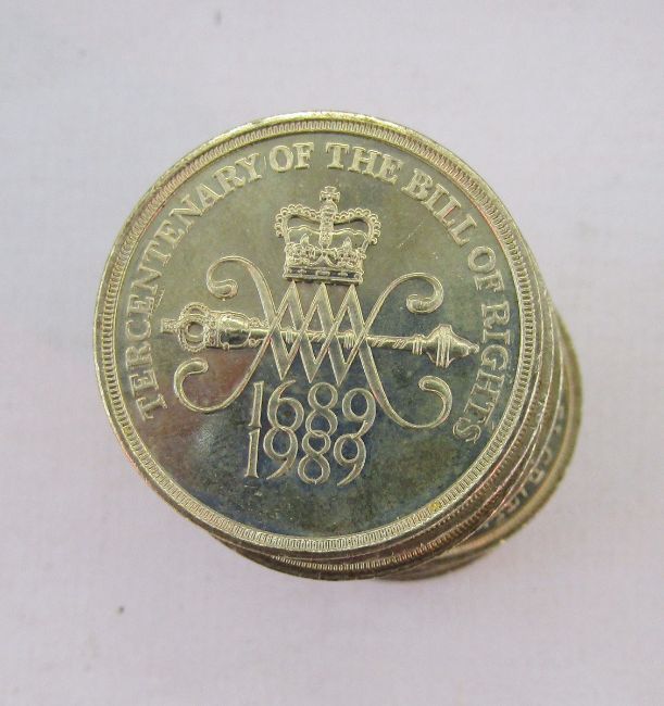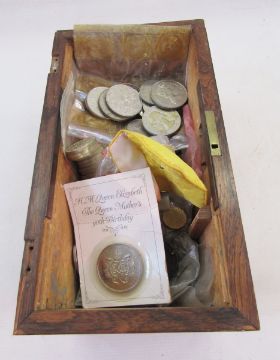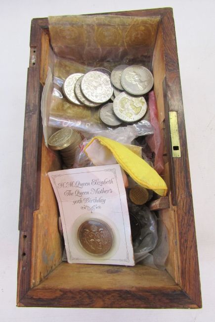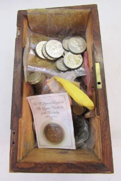 Wooden box containing English and American coins, of interest 7 US dollars and 9 buffalo nickels, 14 x commemorative 1689-1989, two pound coins of which are Bill of Rights and two additional Claim of Rights, some pre-decimal silver coins, the remainder are nickel pre-decimal and decimal coinage.