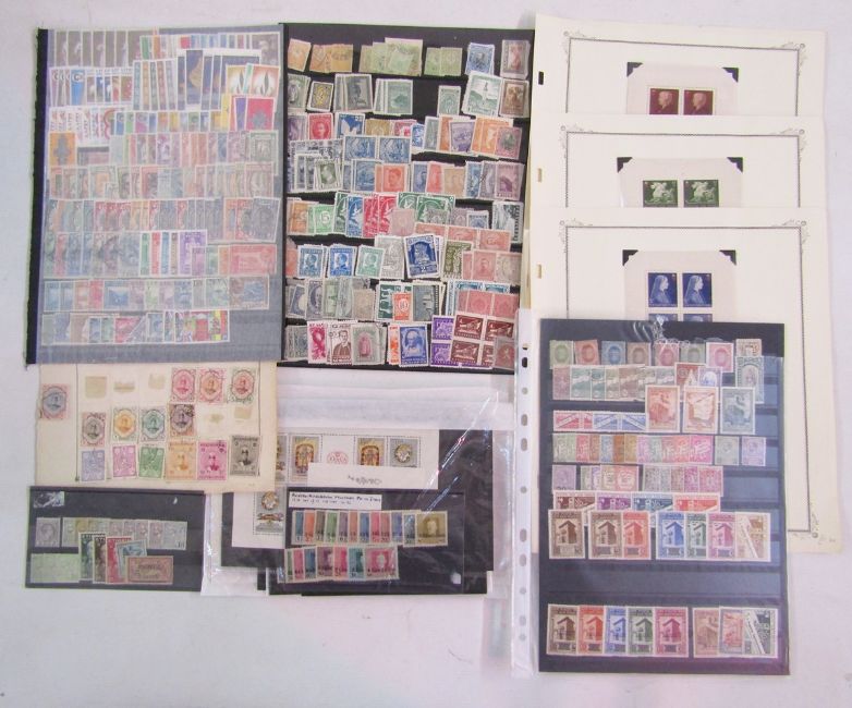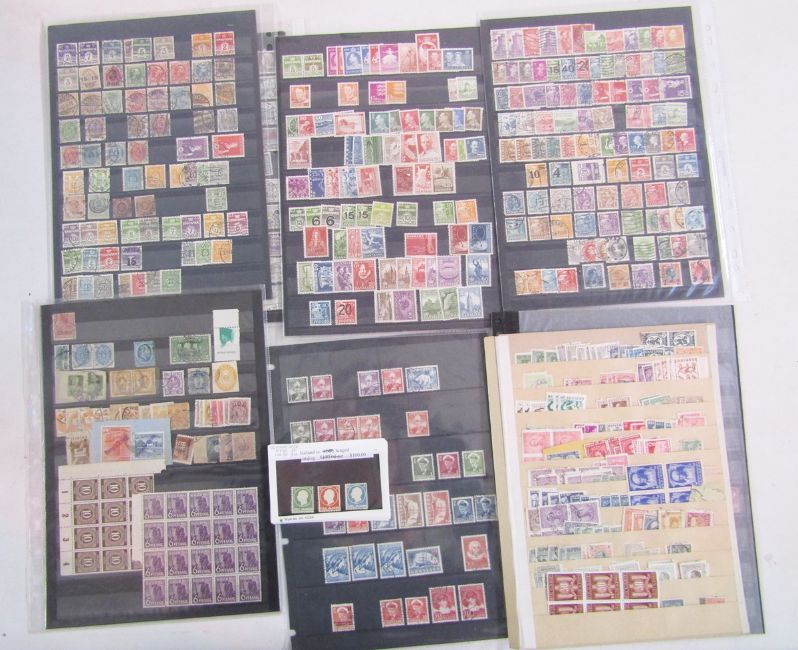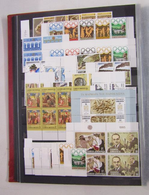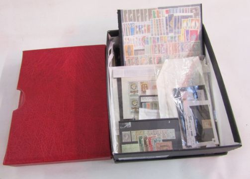 World stamps: Boxed accumulation including red sleeved Lindner album with stock-cards, packets, single country collections in sleeves, some with higher cat and good range of interest. Countries include small amount of GB with Austria, Bosnia, Bulgaria, Denmark, Ethiopia, France & colonies including surcharges and postage dues, much mint 60s-80s Greece (Cat £800+), Hungary, good Iceland, some Italy, early Luxembourg & Syria. Sets, mini-sheets, blocks, and scarcer issues seen.