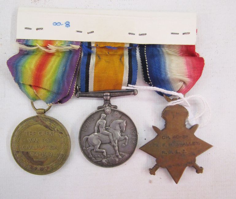 WWI 1915 star, war medal and victory medal, named to 'CH.40.5.Pte.F.R.Smalley.R.M.L.I'