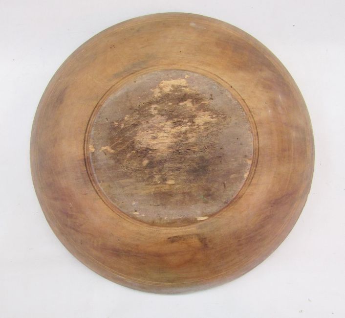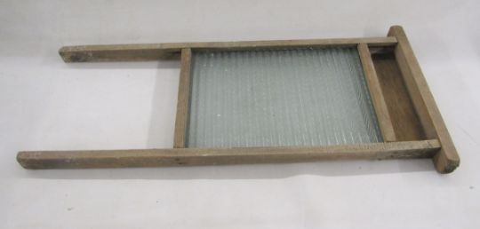 Large treen sycamore dairy bowl, turned with three concentric bands to the exterior, 43cm diameter, a smaller example similar, 31cm diameter (cracked) and three vintage wash boards, one with glass top (5)