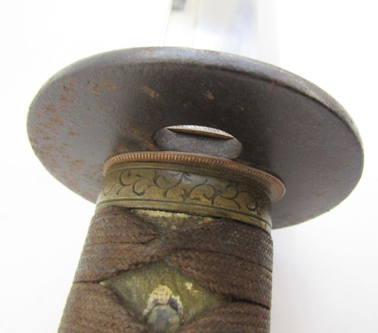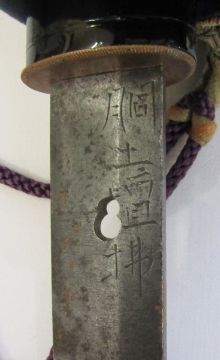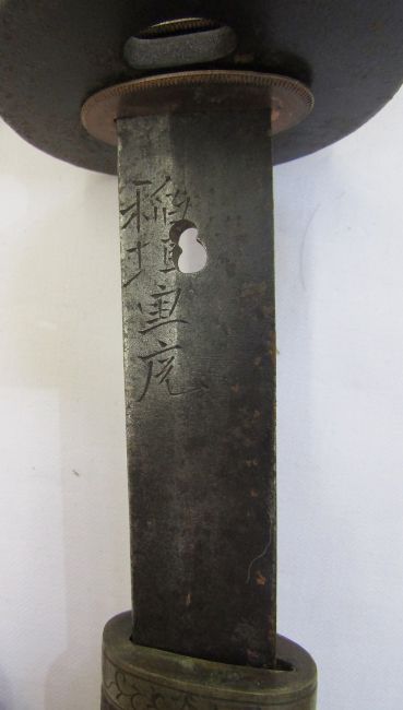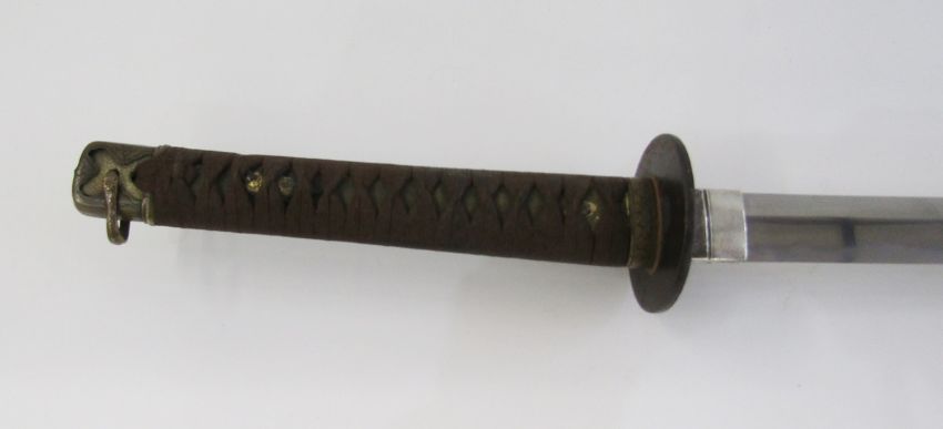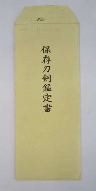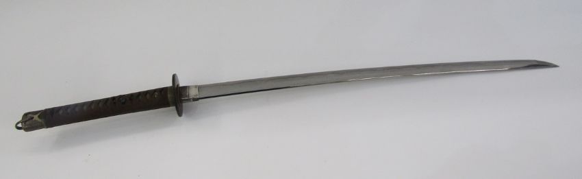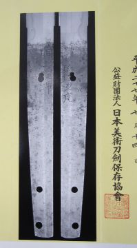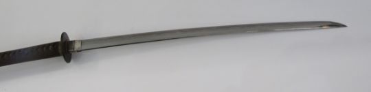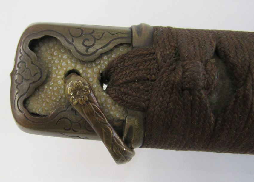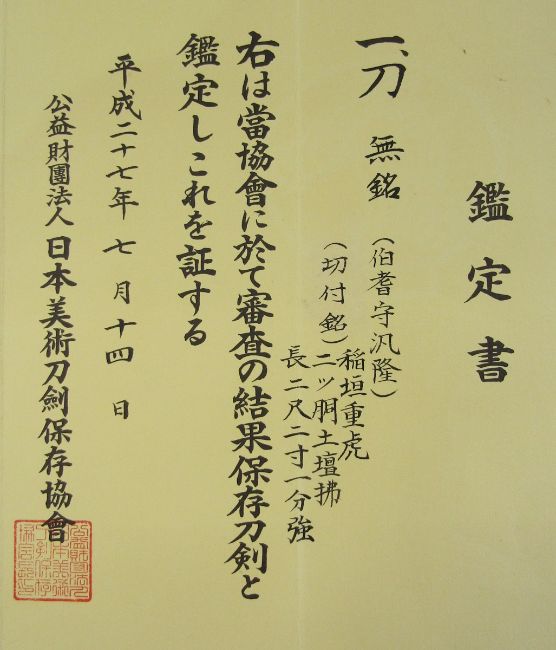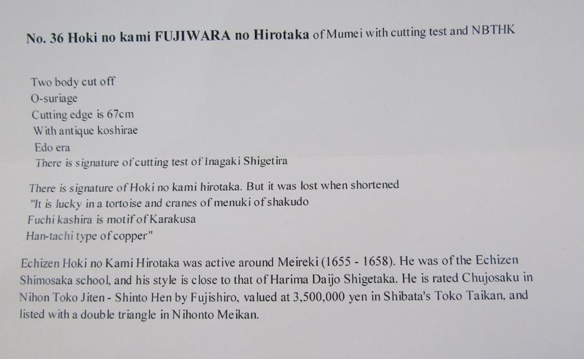 Japanese Edo period Katana, partially signed Hoki No Kami Hirotaka (Meireki 1655-1658), with cutting test signed by Inagaki Shigetira, unsigned bronze tsuba, white metal and copper habaki, the end of the grip covered in shagreen and fitted with engraved metal top, mounted with a gilt metal tortoise and crane menuki to tsuka, with NBTHK certificate, with later lacquered saya (later adaptions, blade shortened), the blade 68 and 89.5cm blade and nakago