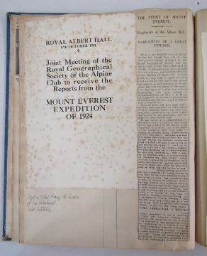 Scrapbook, two diaries and a collection of family photographs of mountaineering interest, circa 1920-30, relating to the Dangar family, particularly D.F.O. Dangar, Hon. member of the Alpine Club, including: rugby match programmes, 1924 Royal Albert Hall lecture programme for the 1924 Everest expedition, various tickets and badges for MCC cricket matches (1920s), Imperial Airways Ltd Grand National ticket 1928, mountain diaries 1922-57, a similar diary from circa 1959-60s, a collection of loose photographs of mountaineering and winter sports