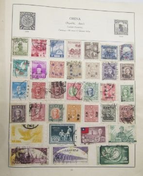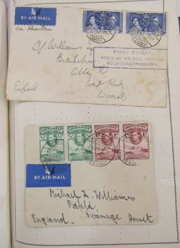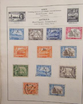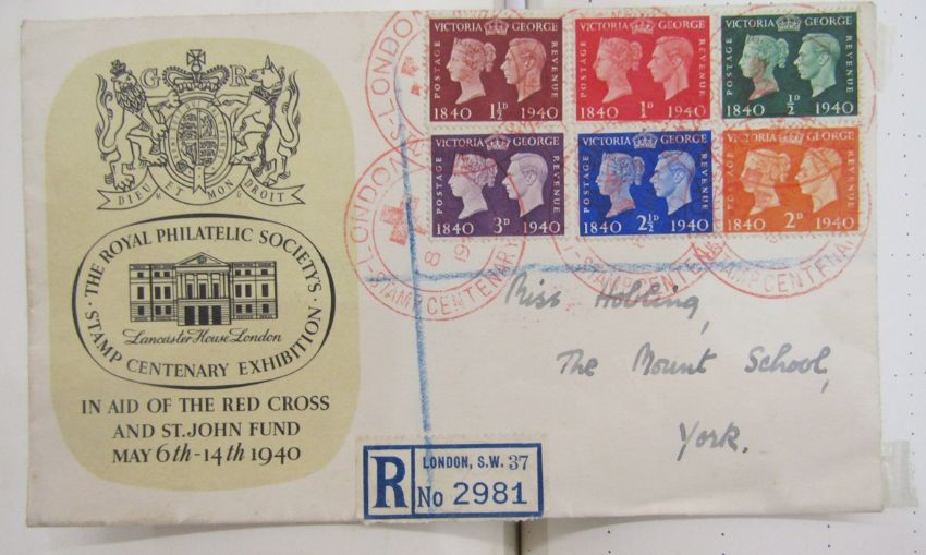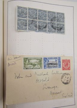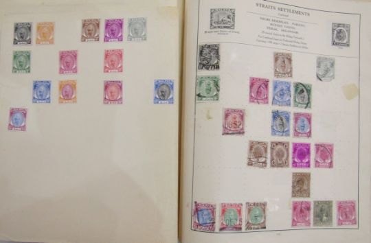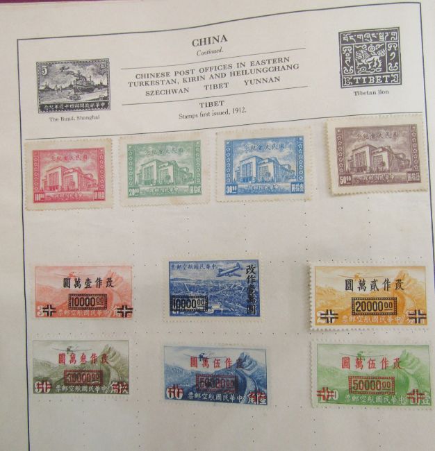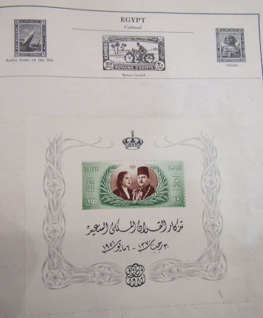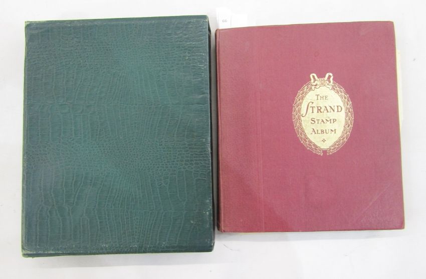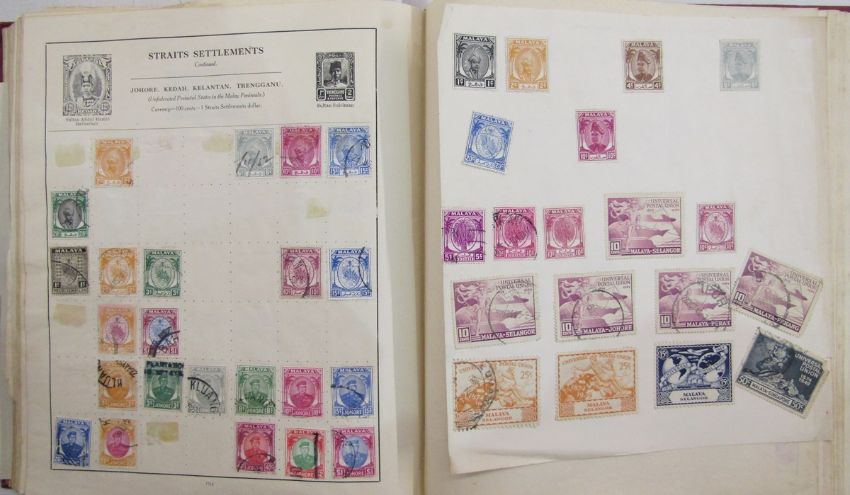 All World stamps: Green Movaleaf in sleeve and red Strand album of mint & used, mostly definitives & commemoratives of GB and other countries such as China, Egypt, India and Malaya. 1940 GB Royal Philatelic Society stamp centenary cover seen.
