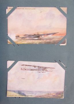 Early 20th century postcard album, including an unmounted Tuck's T.S.S. Titanic and S.S. Orsova, a large number of mounted maritime White Star Line postcards, including: R.M.S. Olympic, S.S. Persic, Baltic and others, a group of military vessel postcards, two of German subs washed ashore (Hastings and St Leonards), a group of aeronautical postcards depicting bi-planes, a monoplane, a group of military postcards depicting the Highlanders, the Life Guards and other regiments, UK landscapes, cocker spaniels, Rin-Tin-Tin (the Wonder Dog), Tom Mix on horseback and others, within a red cloth bound Art Nouveau album