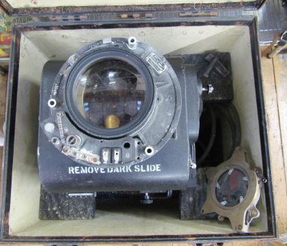 WWII US Airforce Fairchild A-5A aerial night camera, serial no. 75-126-B with a Fairchild night photo shutter lens, no.43-1727, and a Kodak Aero-Ektar F:2.5 12" lens, with leads and accessories, fitted within a studded iron-bound case