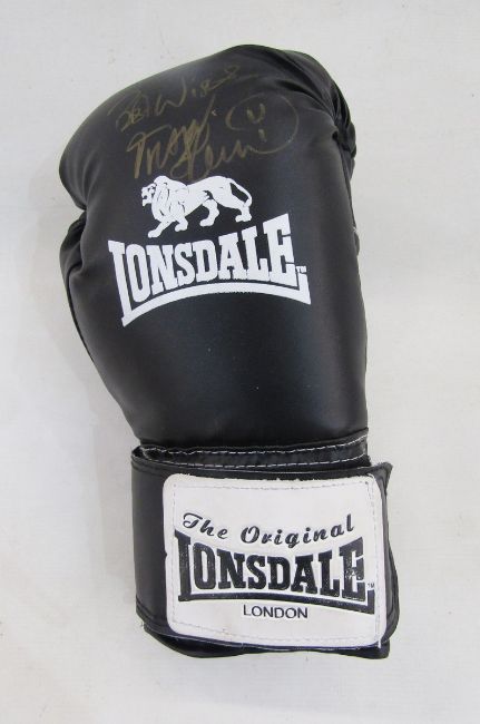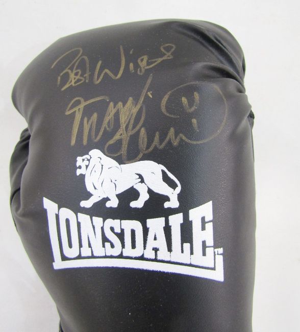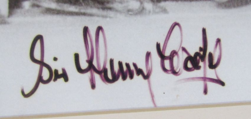 Cased black Lonsdale boxing glove signed by Frank Bruno, a framed black football boot signed by Geoff Hurst, together with a signed print of a boxing match between Henry Cooper and Mohammed Ali, signed by Sir Henry Cooper, the framed boot with certificate of authenticity from UACC, mounted within a box frame with two images from the 1966 World Cup and a signed No. 4 Polo shirt, signed by Tommy Biddle, Robert Cudmore and others and a signed portrait print of motorcycle champion Jim Redman (5) Provenance: from the collection of Mr George Ridgeon, Gloucestershire