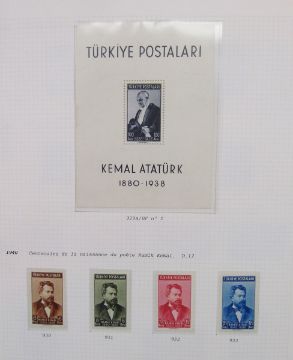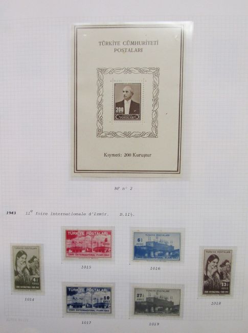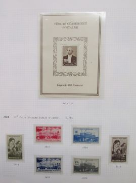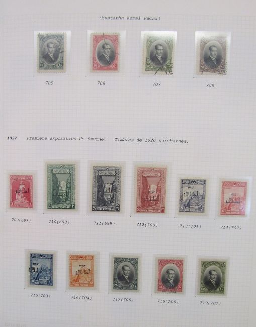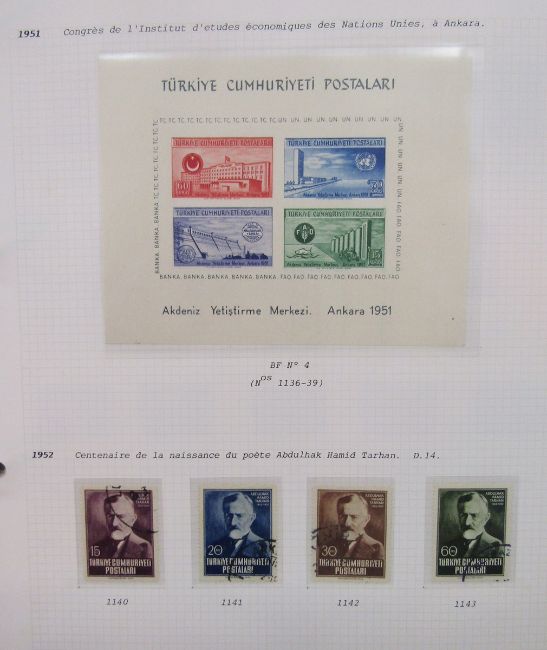 Stamps of Turkey: Large collection in 4 albums of mint & used, 1865-1997, including numerous sets and scarcer issues. Definitives, commemoratives, official, postage due, printed matter, Red Cross, air, charity, fiscal, locals, military post (Thessaly), scarcer overprints and issues of French occupied Cilicia including double-printed 70 paras, SG 89. Blocks, numerous and scarcer sets such as 1927 mint and 1928 used issue for Smyrna Exhibition and air issues of 1937 & 1950. Attaturk 1940, Ineunu 1943 and UN Economic Conference 1952 issue mini-sheets seen.