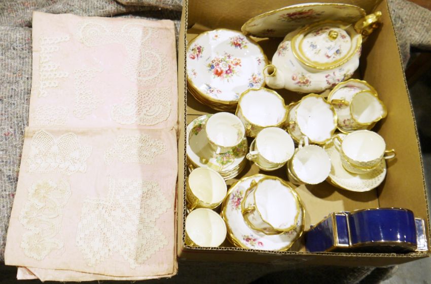 Hammersley Lady Patricia tea service, a Michelle Olsen blue glazed landscape scene clock, four worn nativity figures, a wooden box with union six leather padlock, bearing Southern Railway luggage label, two large glass goblet vases, other glassware and other items (3 boxes)