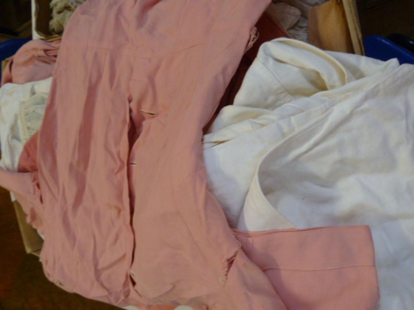 Late 19th/early 20th century silver wire and faux-pearl head piece, possibly bridal, two feather hat accessoriesan early 20th century diamante broochtwo silver bowsa silk faux-flower decoration, and various mid 19th century items to include a 'Poke' bonnet, printed cotton in purple with stripes and flowers, bow detail to the back and tie fastening under the chin, a tightly pleated white collar 'Puritan' style, with broderie anglaise trim to the side, and a plain fichu attached, a white cotton 'mob' cap, three other lawn cotton with lace trim, all rather stained and worn, a baby's bonnet embroidered satin, a brown velvet hat, a late 19th century shawl in a Persian style design and a selection of 1950s maid's dresses, some labelled 'nursery...' in pink and mauve cotton, with stiff collars, belt, and sleeve protectors