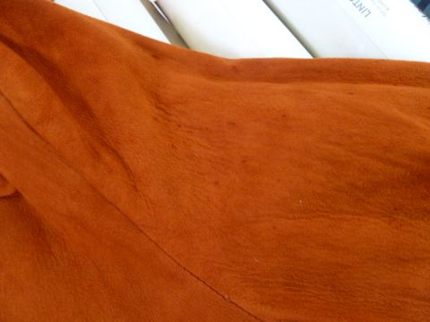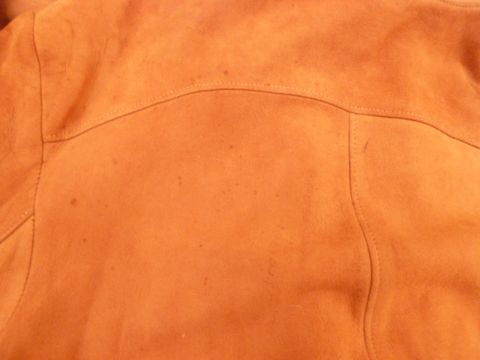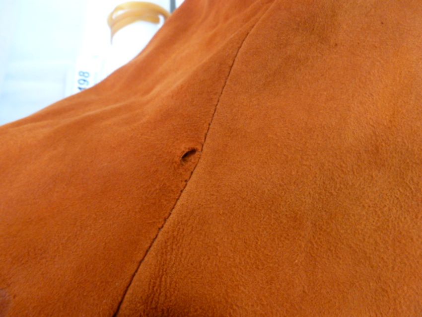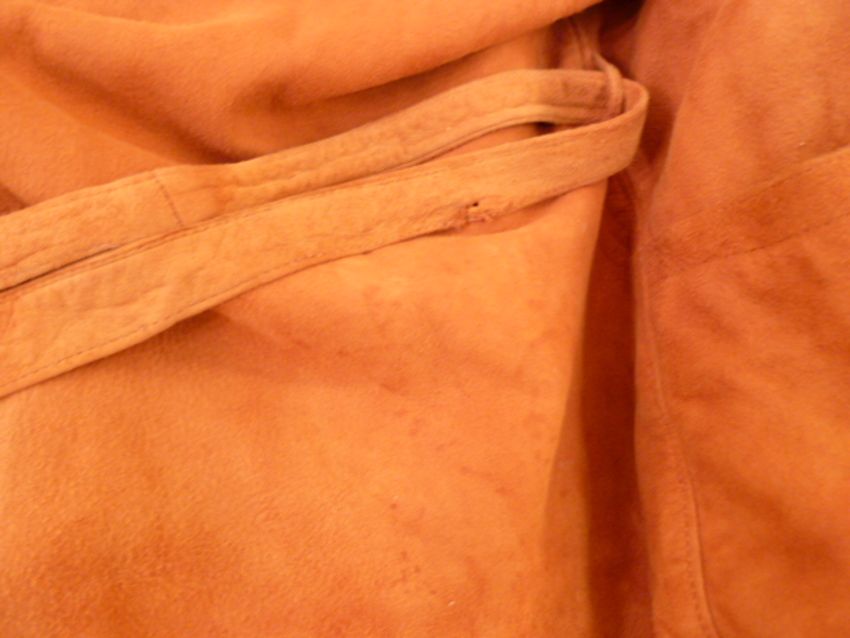 This jacket has had wear, some rain stains, and a slit in one sleeve. Also the belt is worn and repair to to the lining at the collar. Please see new images