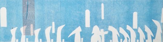 Sallie Taylor  Screenprint  "Last Supper", church interior with figures, on a blue ground, signed in pencil lower right, 20cm x 58cm