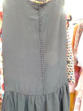 Black silk 1920's dress labelled 'Brands Limited of Belfast' with embroidered hem, embroidered detail to the pockets, the yoke and to the front of the dress, tiny button detail to the back with a drop waist  and popper fastening to one side Condition Report The embroidery on this dress is wonderful. The reverse almost as the same as the good side. There are a couple of slits in the silk in the front of the skirt and one on the back. See images. Also wear to the underarms.Again see images