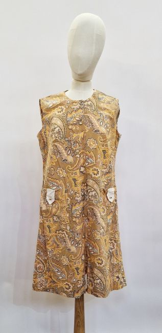 A lime green mini dress, curled ribbon detail to the bodice, scoop back with button and loop fastening, a 1940's brown crepe day dress, printed with flowers, elbow length sleeves with frill, frill detail to the bodice, a 1960's sleeveless cotton dress, yellow and brown paisley style print, front pockets with white tab and brass button detail, button fastening to the front, labelled 'Sungleam', 1930's rayon dress, yellow, with appliqued flower detail to the collar and tie belt, replaced buttons, 1950's black cocktail dress, printed with bold flower pattern, chiffon sleeves, scoop neck, a 1950's blue polka dot dress, with over skirt, tiered bodice with button detail, full length (6)